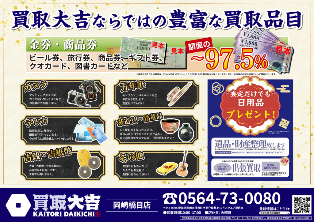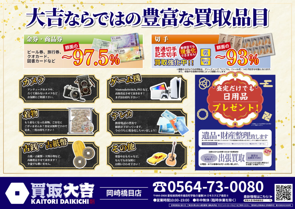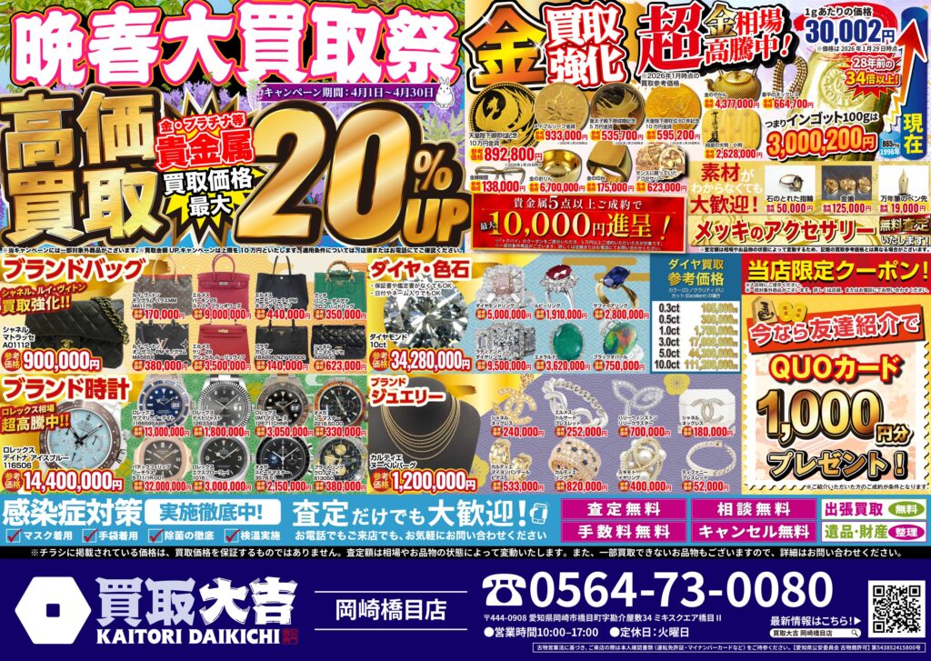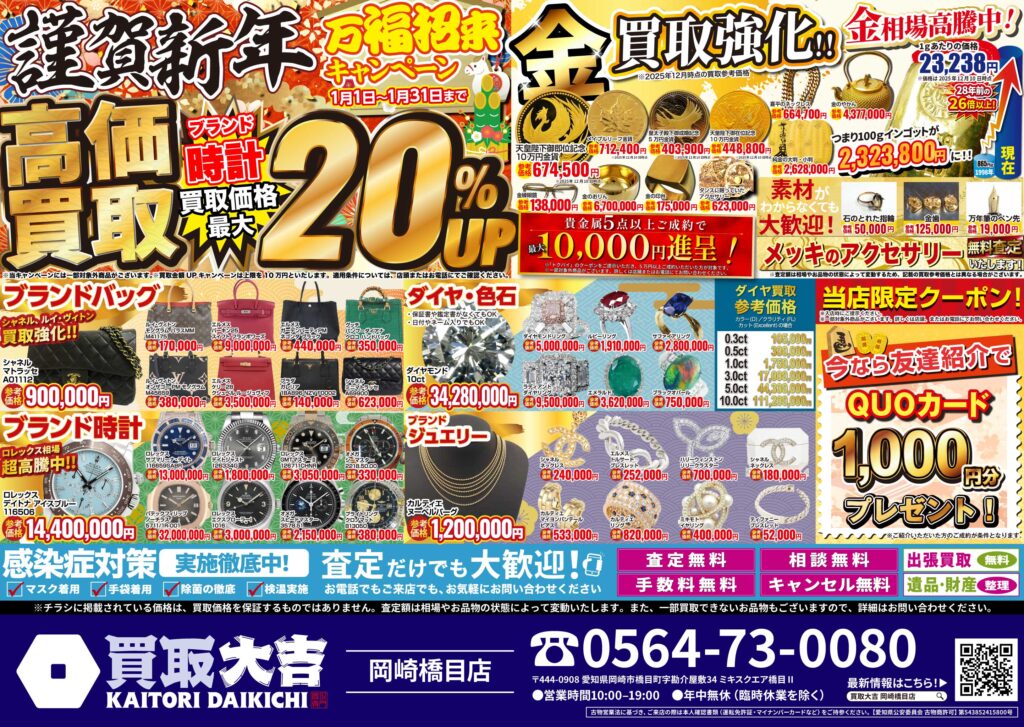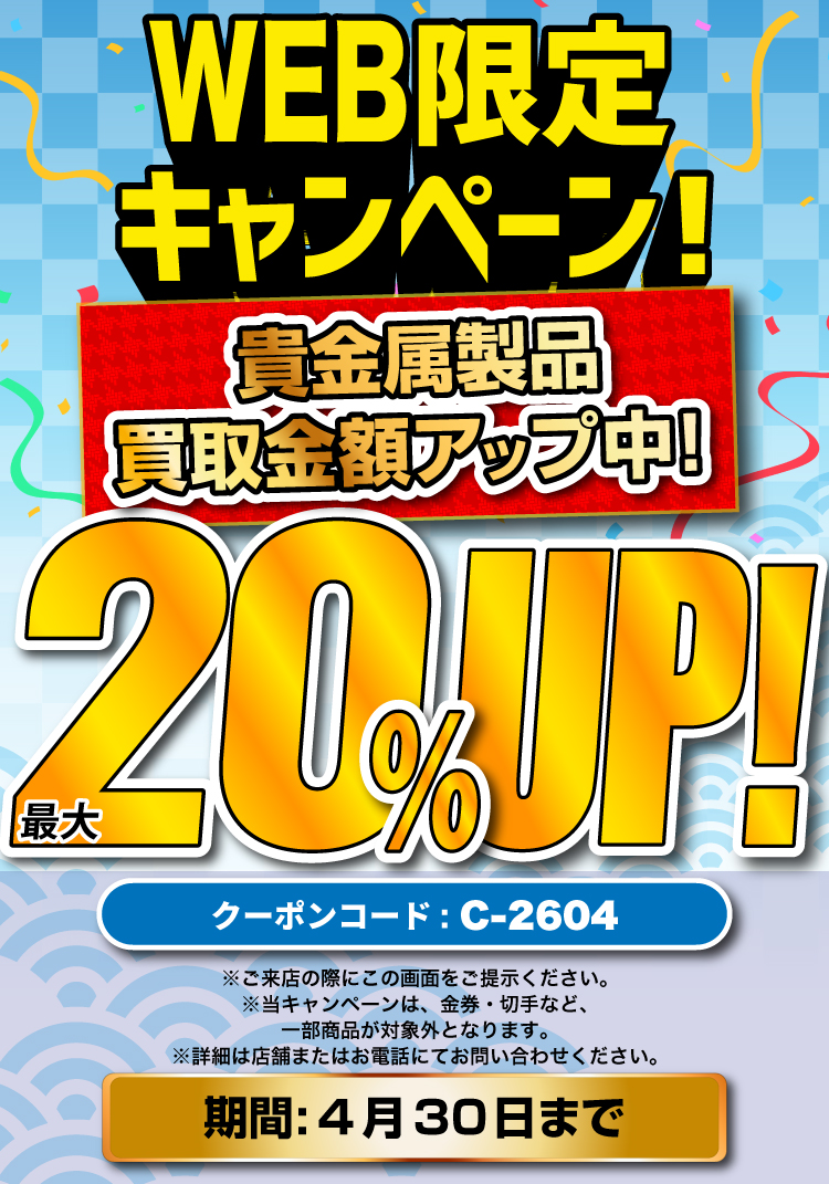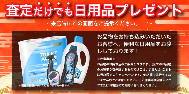 キャンペーン実施店舗 よくあるご質問 買取価格は主にどんな要素から決まるのでしょうか? お品物の状態や付属品の有無、最新相場、流通量などによって買取価格を算出します。 どんなものを買い取ってもらえますか? 金・貴金属・ブランド品はもちろん、お値段がつくか迷われているものも是非お持ちください。 傷や汚れのあるアイテムでも買取可能ですか? 大歓迎です。未使用品などのお持ち込みは少なく、傷や汚れのあるアイテムをお持ちいただく方が半数以上です。状態の悪いお品物やカビなどがあってもお買取可能なケースもございます。 どんな情報があればすぐに査定額を教えてもらえますか? お品物の名前や種類、状態、またはブランド名、型番などの情報があると、概ねの査定額をお伝えできるかと思います。 店舗での査定時間はどのくらいですか? お品物の種類や個数にもよりますが、約5分から30分ほどの査定時間となるケースが多いです。事前にある程度の査定時間をお伝えいたしますので、ご安心ください。